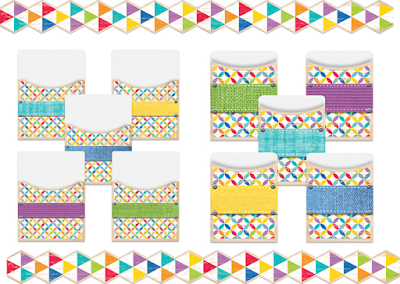 I want to show you how you can use this in your classroom, but pairing each piece with borders and signs!Here are the Upcycle Style library pockets (extra large and standard size) and the Rustic Triangle border! The pocket fronts come with different sized rectangles for labeling. There are so many things you can do with these pockets! One way I would use them is to put a classroom job on the front and put a craft stick with a student's name to display who has what classroom job for the week!